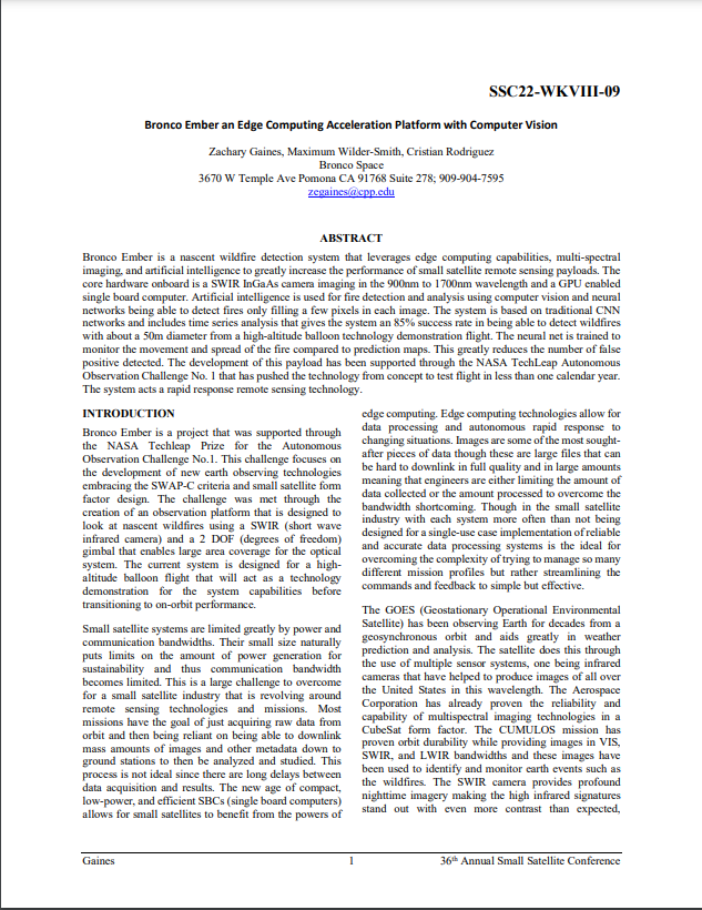 Bronco Ember is a NASA TechLeap Autonomous Oberservation Challenge Winner Bronco Ember is a nascent wildfire detection system that uses a combination of artificial intelligence, edge computing, infrared imaging, and a 2 degree of freedom gimbal. The system is designed to be small and compact while still being able to provide large impact to the wild fire prevention and detection industry. The system has already undergone its first test flight that provided successful results and a proving ground to continue development on the emerging technology. The system is udergoing continued development to refine and improve the system that is capable of indentify a fire that is less than 20 feet in diameter in 5 minutes or less after first ignition. To learn more about Bronco Ember you can view some of the additional resources linked in this repository or feel free to contact Zachary Gaines (zegaines@cpp.edu) with any inquiries.